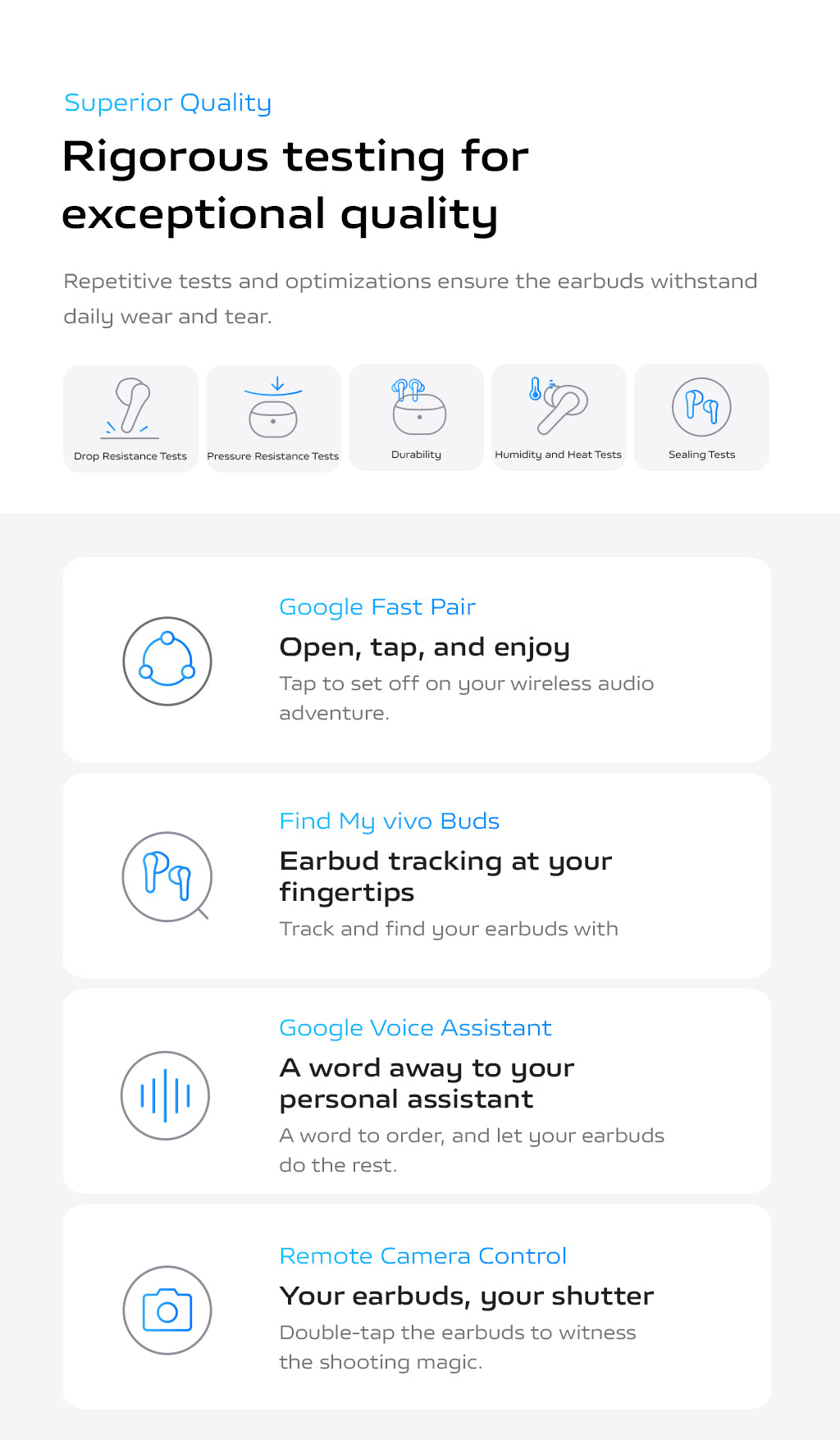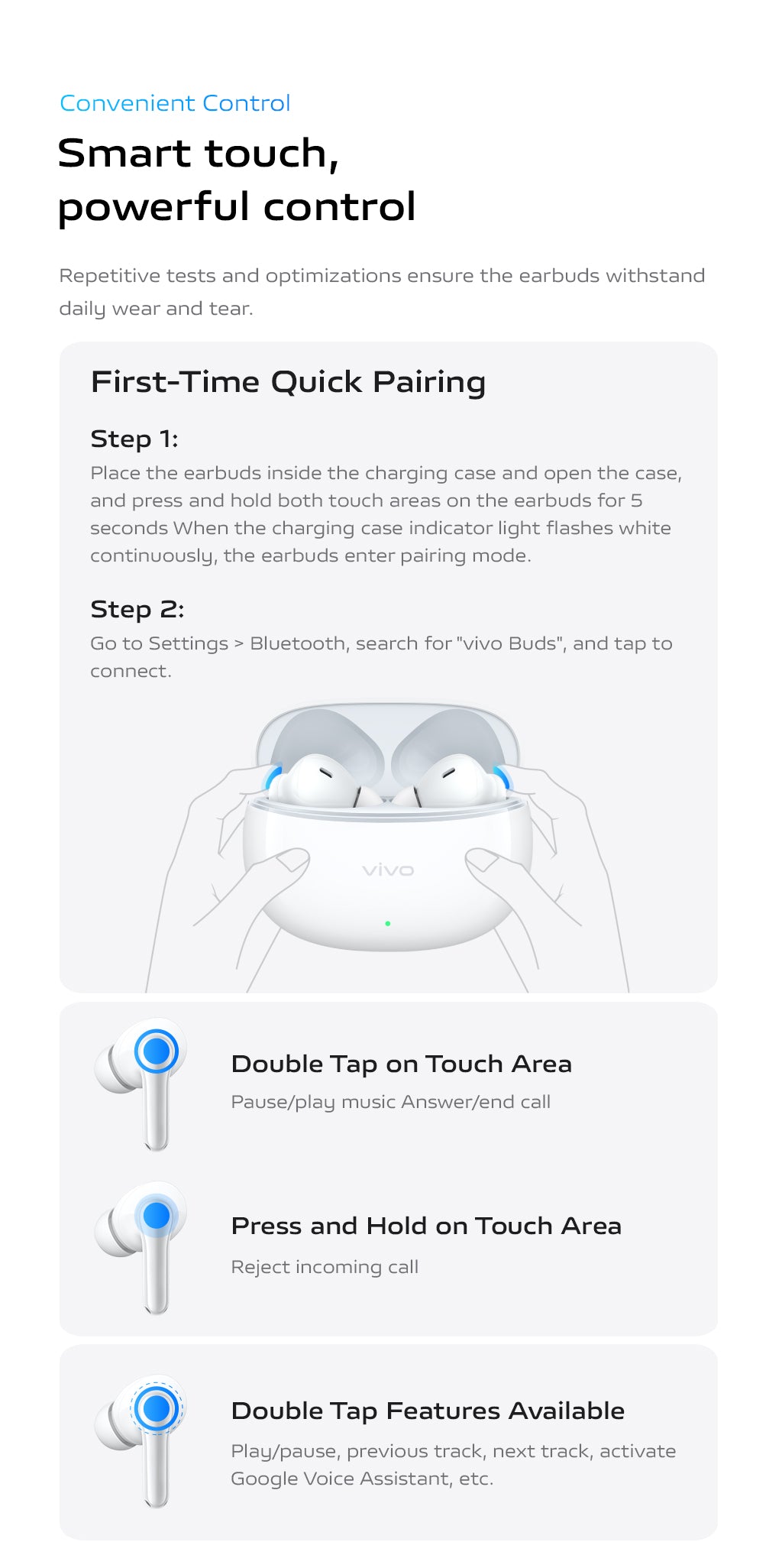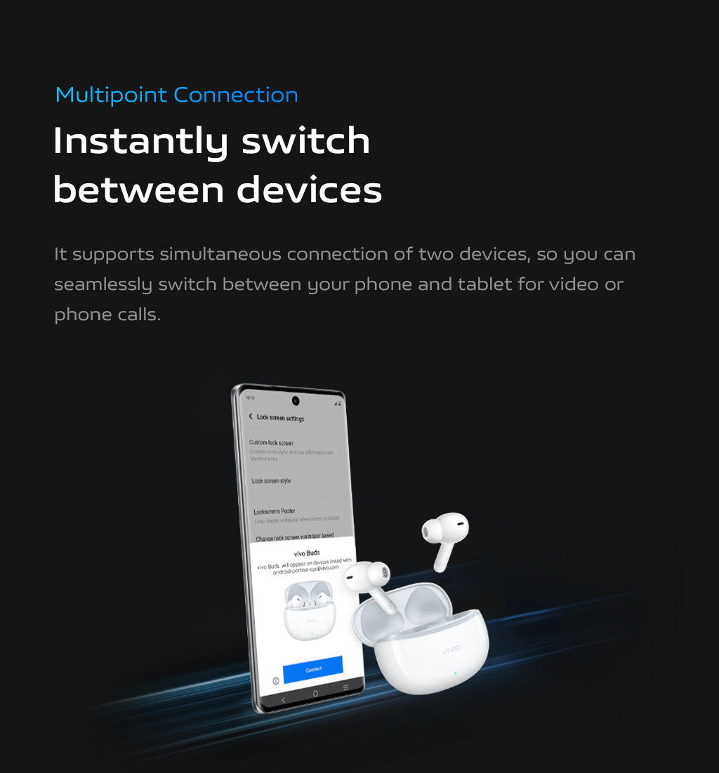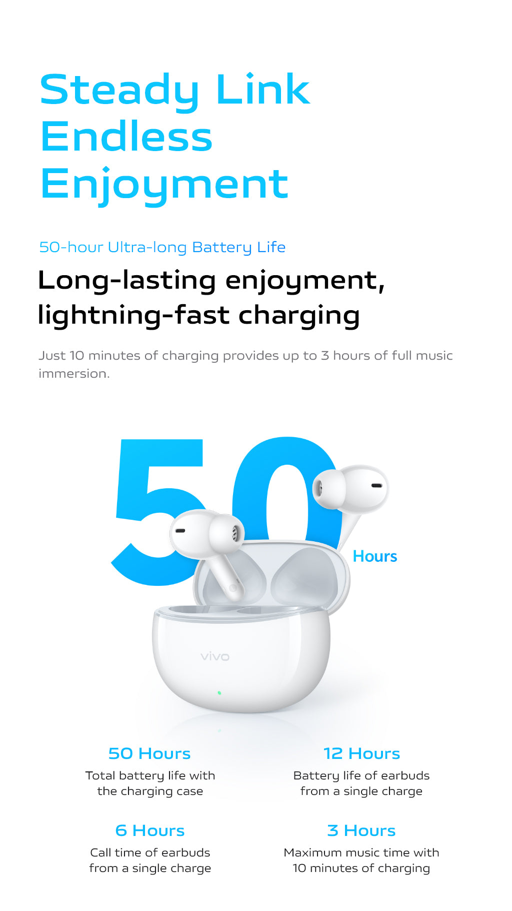 50Hr Ultra-Long Battery Life | Stable Connectivity Bluetooth 5.4 + Multi-Point Connection | Super Low Gaming Latency | Al Call Noise Reduction + Wind Noise Resistance | vivo DeepX 3.0 Sound Effect | Google Voice Assistant / Touch Control / Remote Camera Control / Find My TWS | Stylish Lightweight Design, Comfortable Ear Stems | IP54 Dust and Water Resistance