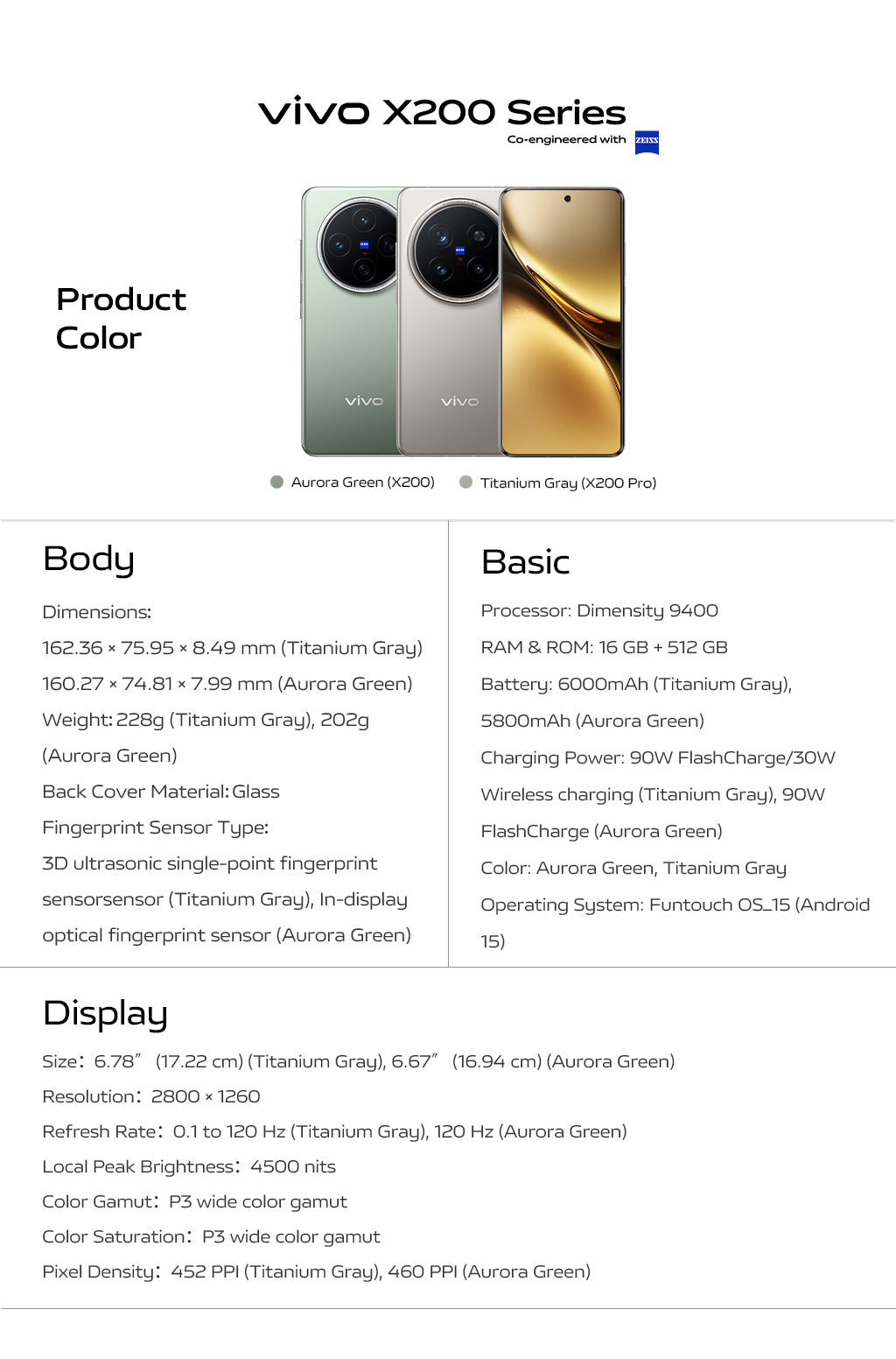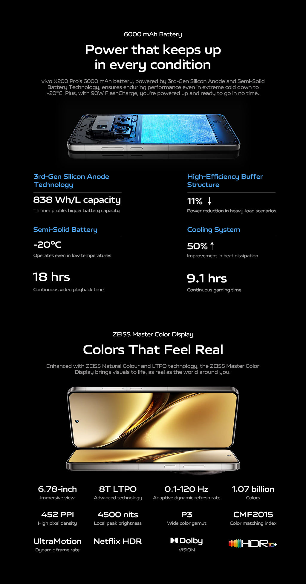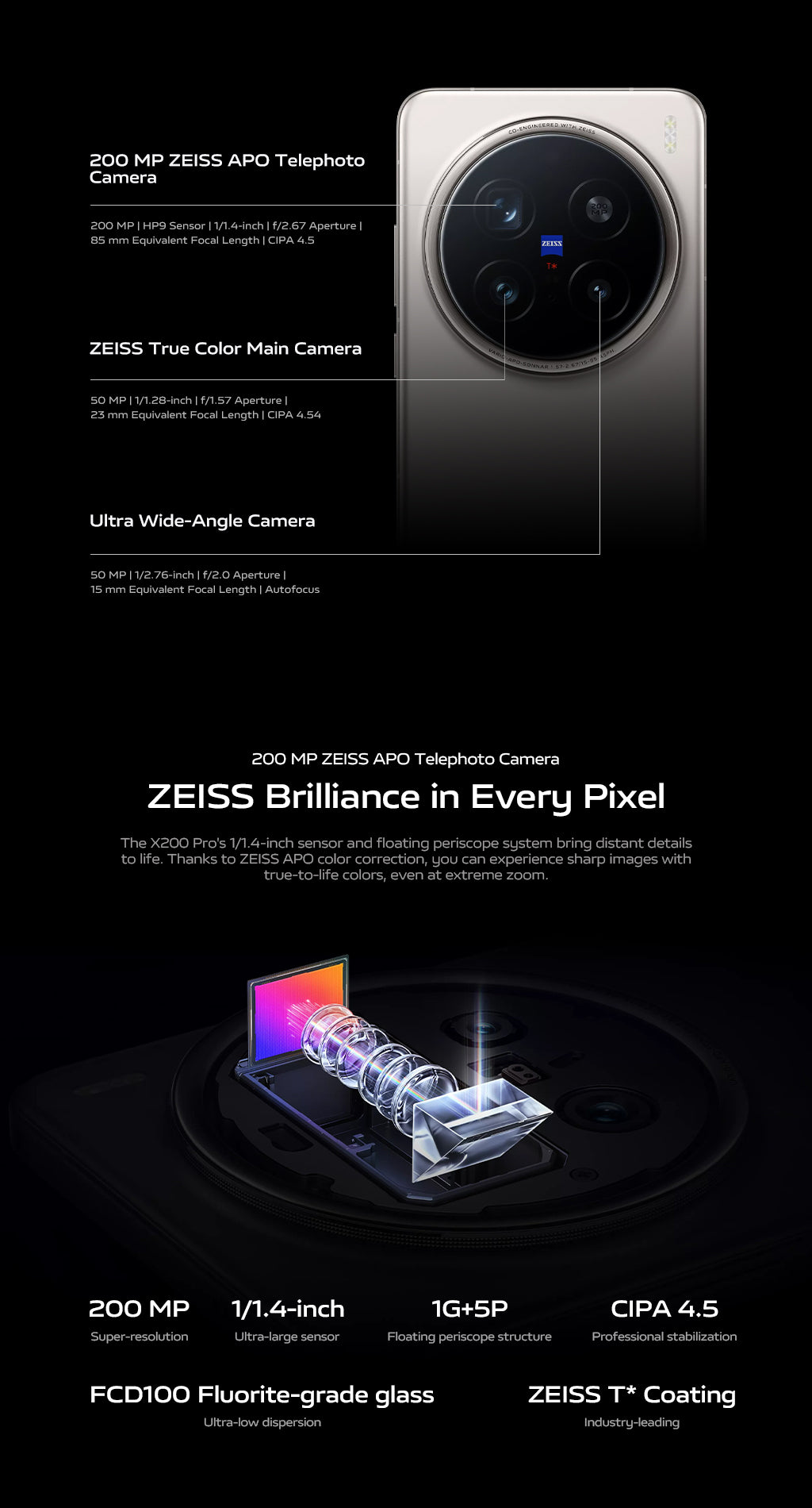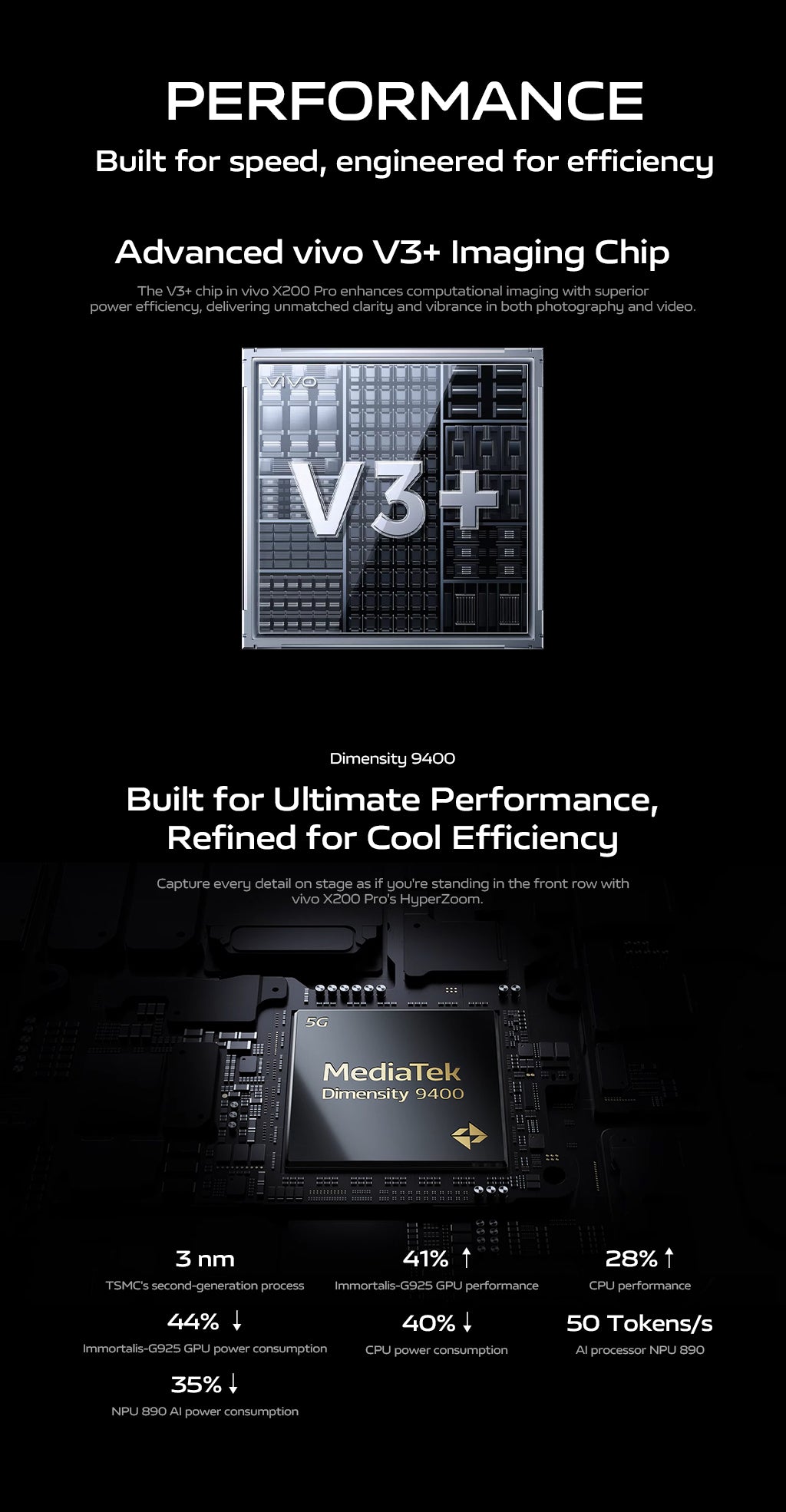 200MP ZEISS APO Telephoto Camera | 5OMP ZEISS Trve Color Main Camera with vivo x SONY LYT-818 Sensor | 5OMP ZEISS Ultra Wide-Angle Camera | 4K HDR Cinematic Portrait Video | vivo V3+ Chip + MediaTek Dimensity9400 | 6000mAh Large Battery + 90W FlashCharge/ 30W Wireless FlashCharge | IP68 & IP69 Dust and Water Resistance | 120Hz AMOLED Screen with SGS Low Blue Light Certification