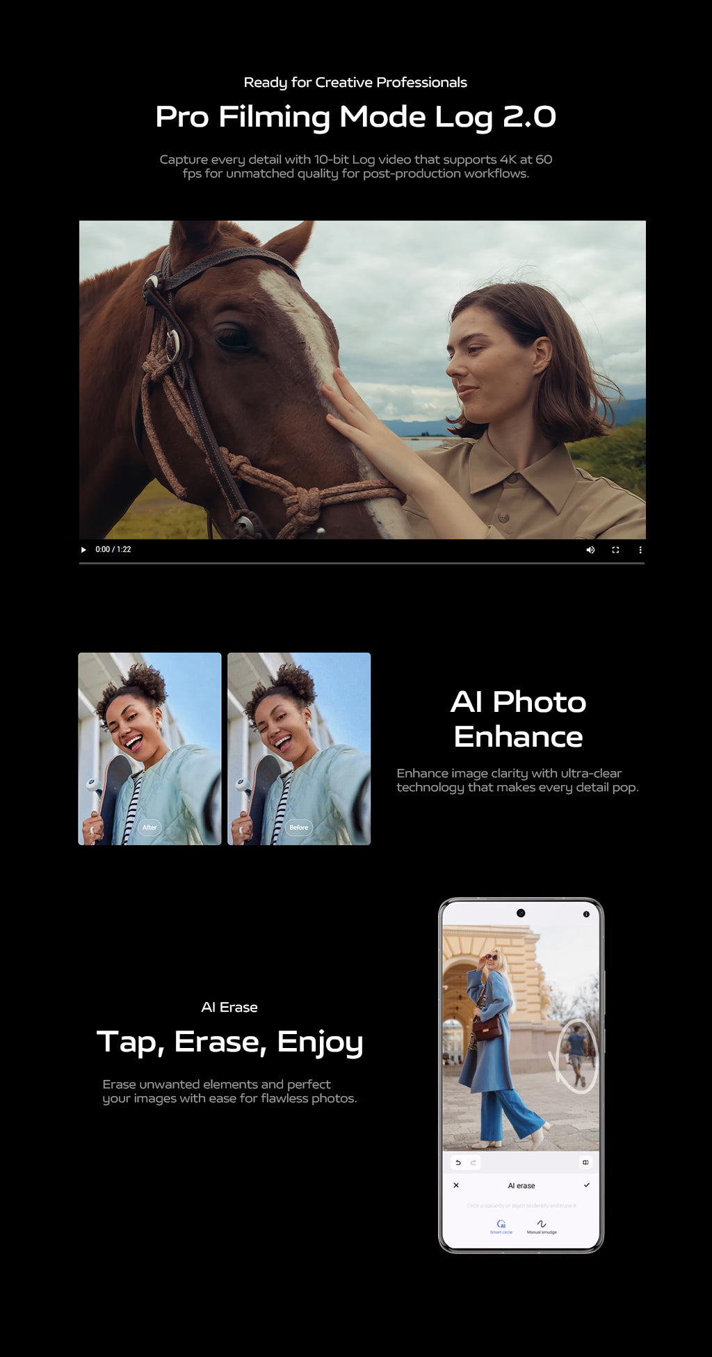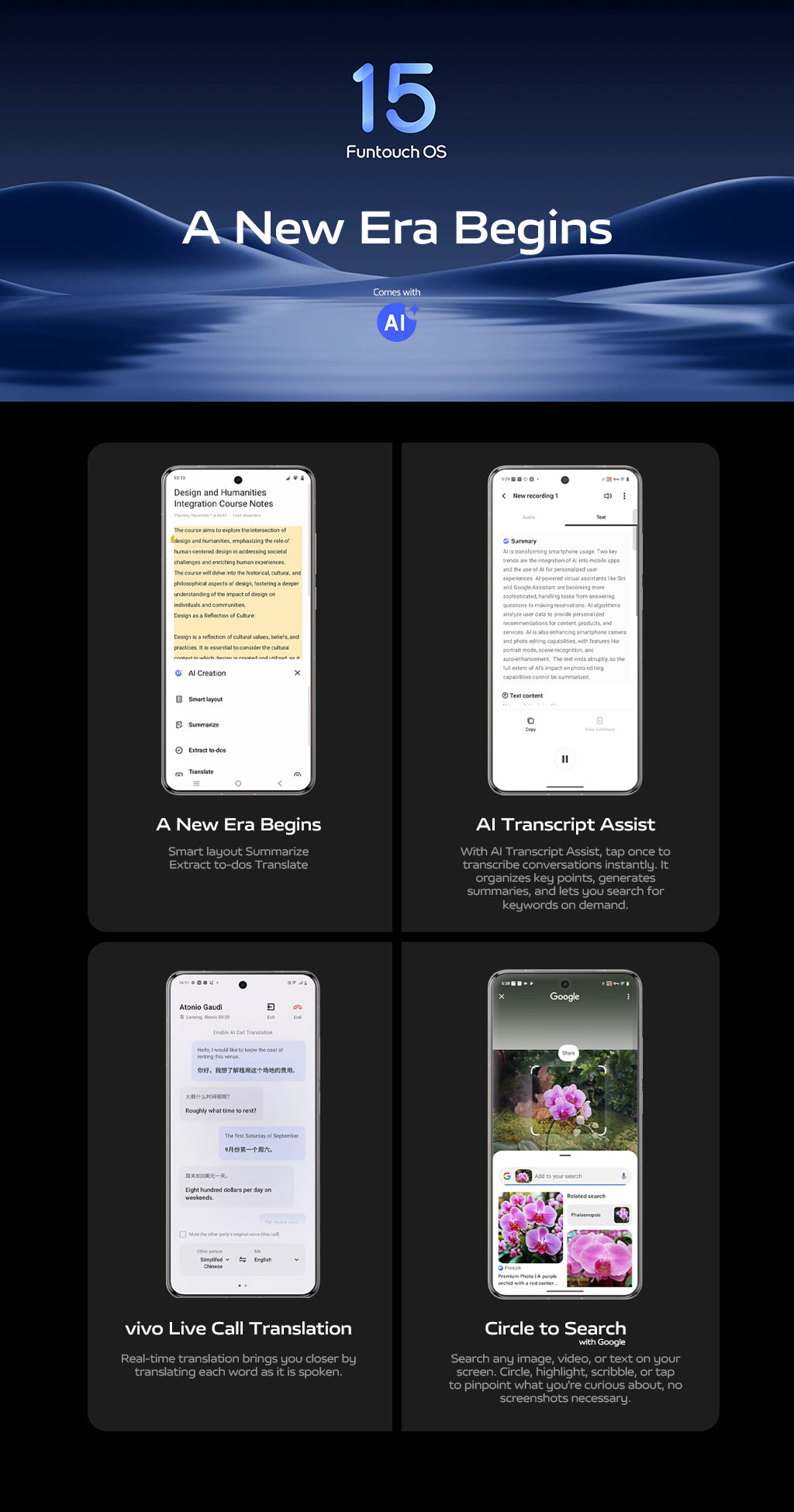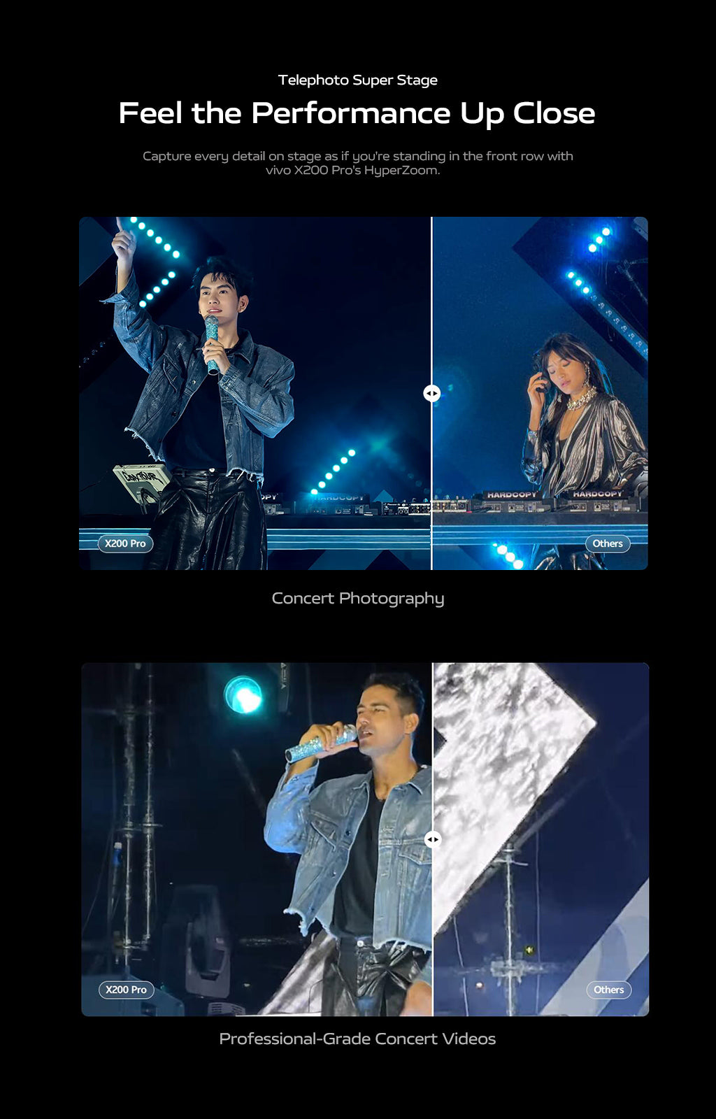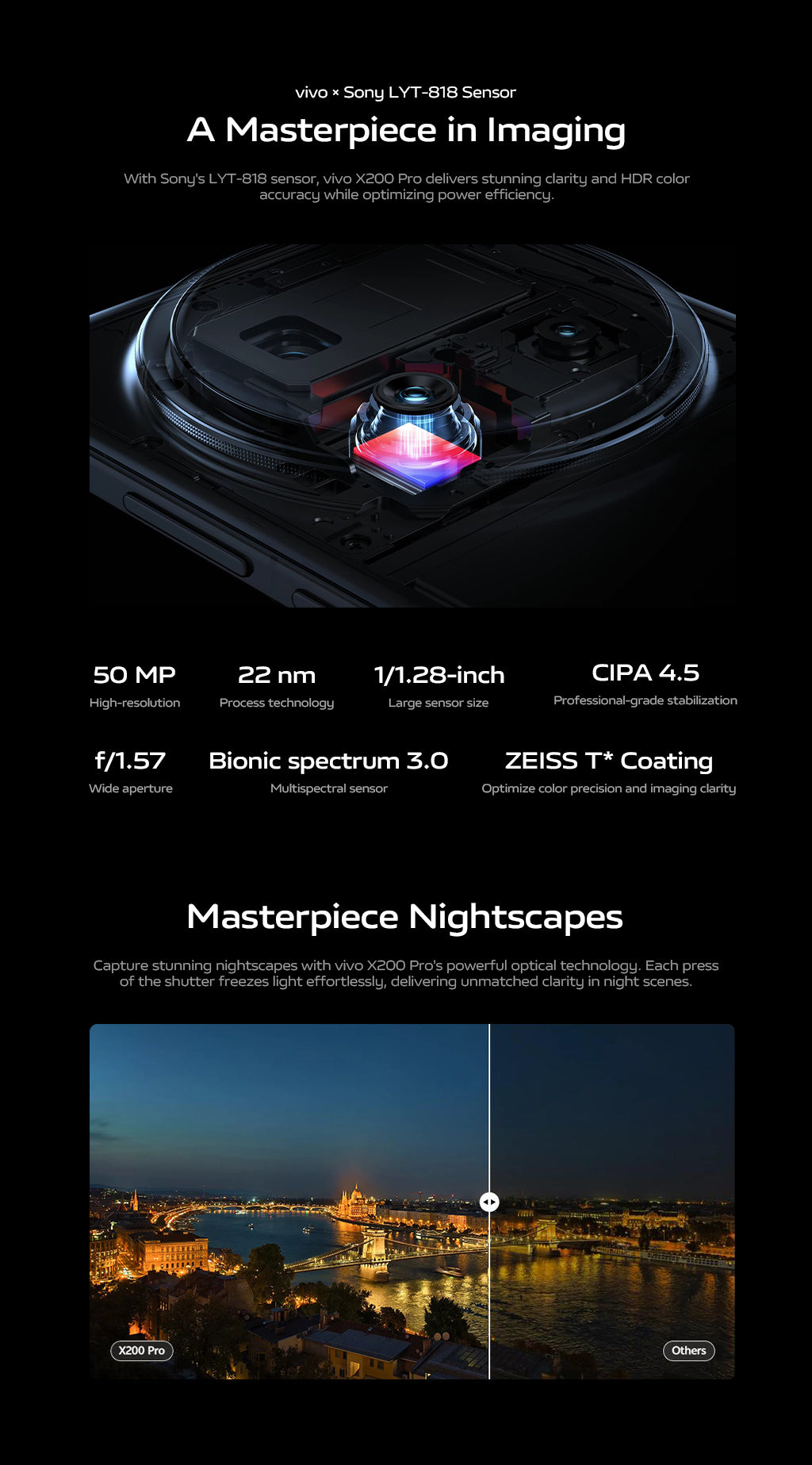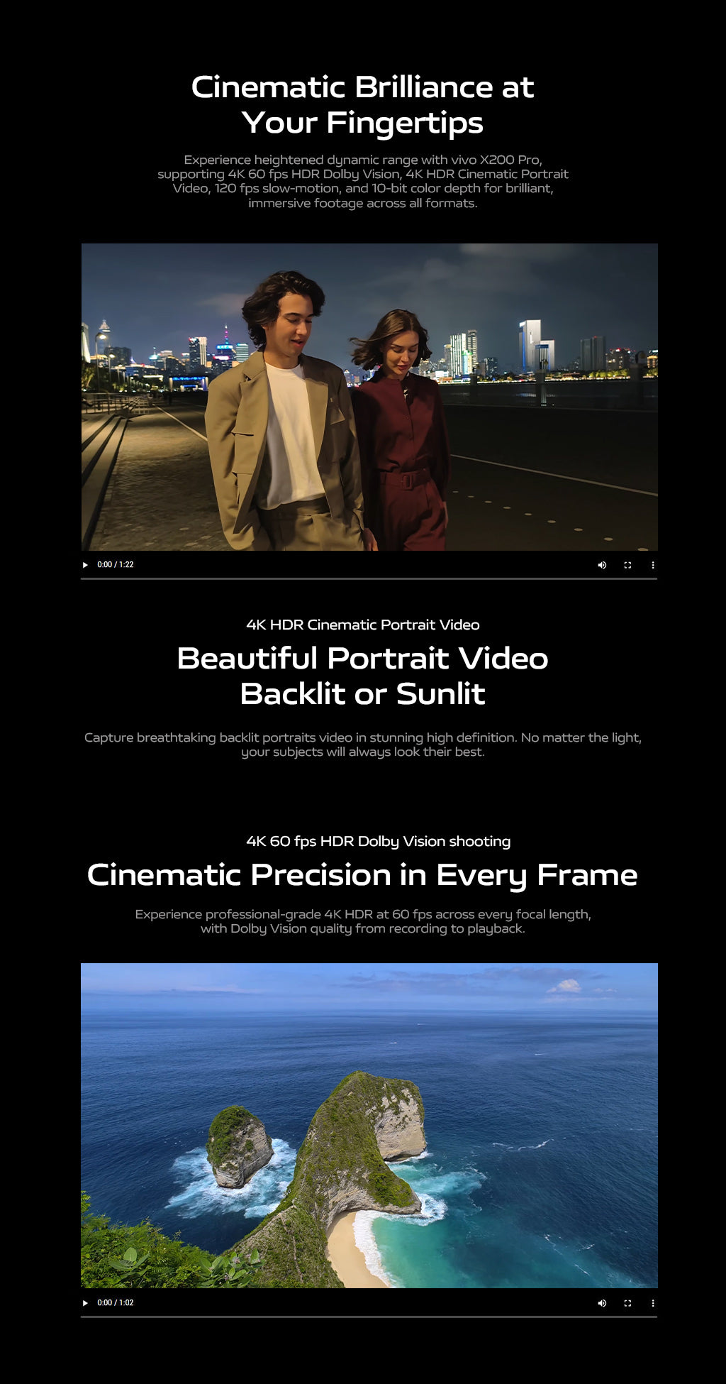 200MP ZEISS APO Telephoto Camera | 5OMP ZEISS Trve Color Main Camera with vivo x SONY LYT-818 Sensor | 5OMP ZEISS Ultra Wide-Angle Camera | 4K HDR Cinematic Portrait Video | vivo V3+ Chip + MediaTek Dimensity9400 | 6000mAh Large Battery + 90W FlashCharge/ 30W Wireless FlashCharge | IP68 & IP69 Dust and Water Resistance | 120Hz AMOLED Screen with SGS Low Blue Light Certification