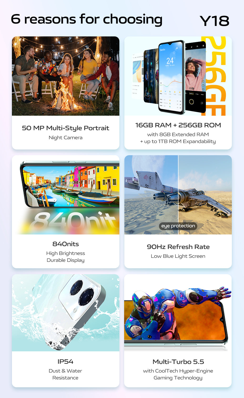 50MP Multi-Style Portrait Night Camera | 16GB RAM + 256GB ROM with 8GB Extended RAM + up to 1TB ROM Expandability | 840nits High Brightness Durable Display | 90Hz Refresh Rate (Low Blue Light Screen) | IP54 Dust & Water Resistance | Multi-Turbo 5.5 with CoolTech Hyper-Engine Gaming Technology | 5000mAh All Day Battery & 15W Fast Charging | Android 14 OS (Funtouch OS 14)